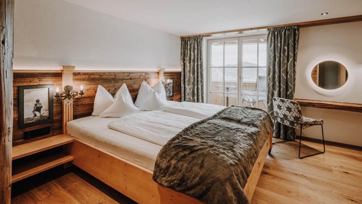 Doppelzimmer im Älplercharme mit hochwertigen Altholzmöbeln, modernem Duschbad, Minibar und Südbalkon mit Blick auf die Oberstdorfer Berge.