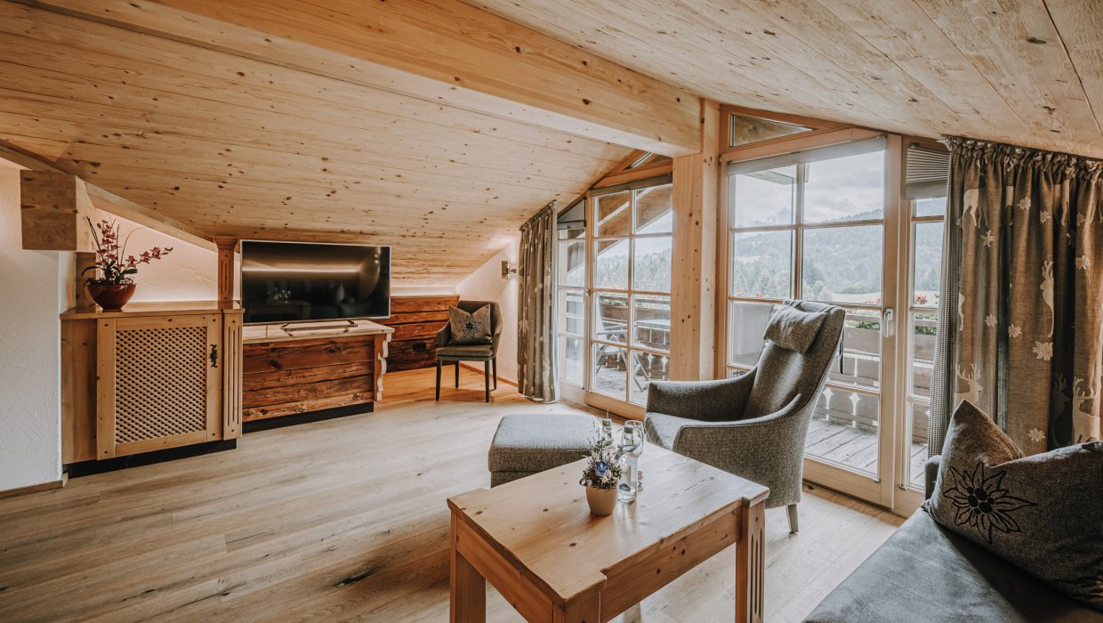 Wohn-/Schlafbereich mit Doppelbett (180 × 210 cm) | hochwertige Polstermöbel | Holzdielenboden und Fußbodenheizung | Flachbildschirm mit SAT-TV und Radio | Minibar | Zugang zum Balkon